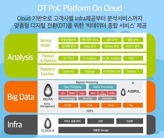 회사측은 클라우드 제트 기반 온 디맨드(On Demand, 수요자 중심의 시스템) 가상 환경은 물론 제조 기업이 필요로 하는 모든 유형의 분석 서비스를 망라한 BDA(Big Data Analytics)∙머신러닝∙ 딥러닝 등 ‘DT Full Service(DT종합서비스)’를 PoC 플랫폼에서 한 번에 제공한다는 계획이다.