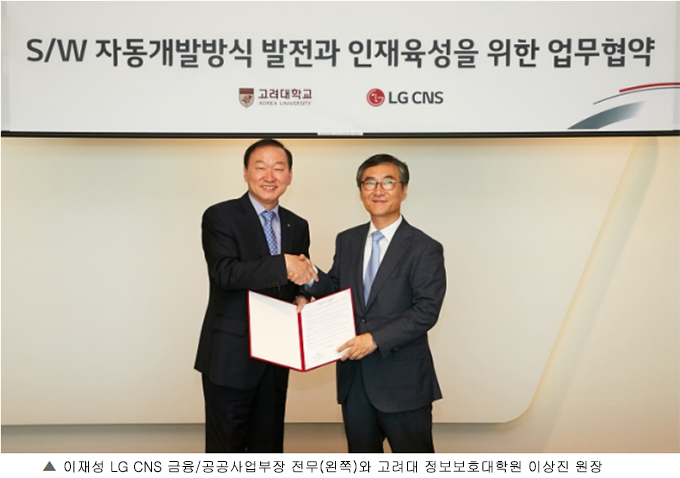 LG CNS(대표 김영섭)와 고려대학교 정보보호대학원(원장 이상진)이 최신 SW 자동개발방식인 MDD(모델 기반 개발) 발전과 인재 육성을 위한 업무협약(MOU)을 체결했다.