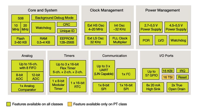 신규 MCU가 포함된 NXP의 S08 마이크로컨트롤러는 코드워리어 IDE(codeWarrior IDE) 지원을 받는다. MC9S08PT60 TWR 시스템은 MC9S08P 제품군 기능을 시연하도록 설계된 저비용 독립형 데모 보드이다. 데모로 사전 프로그래밍 되었으며, 빠르고 비용 효율적인 제품 평가 및 애플리케이션 개발이 가능하다.