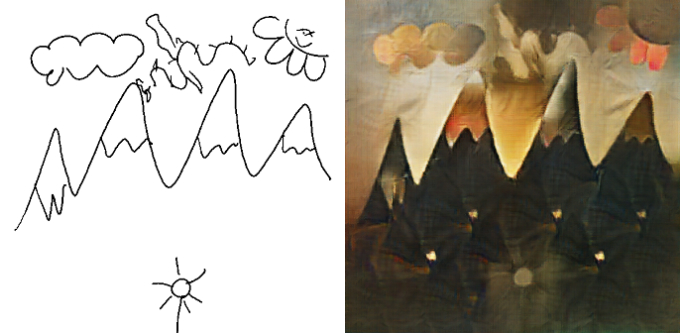 ▲선으로 간단하게 그린 그림(왼쪽)과 해당 그림에 빈센트 AI를 적용해 왼성된 작품(오른쪽)