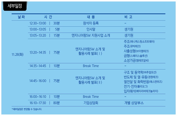 상담회는 먼저 생기원의 엔지니어링SW 지원 사업 소개로 시작되며, 곧바로 엔지니어링SW 소개 및 활용사례 발표가 진행된다. 발표는 생산공정과 성능검증으로 구분된다. 생산공정의 경우 주조, 사출성형, 금형, 소성가공으로 구분해 참여 기업 애니캐스팅소프트웨어, 큐빅테크, 브이엠테크, 스페이스솔루션, 엠에프알씨가 발표한다.