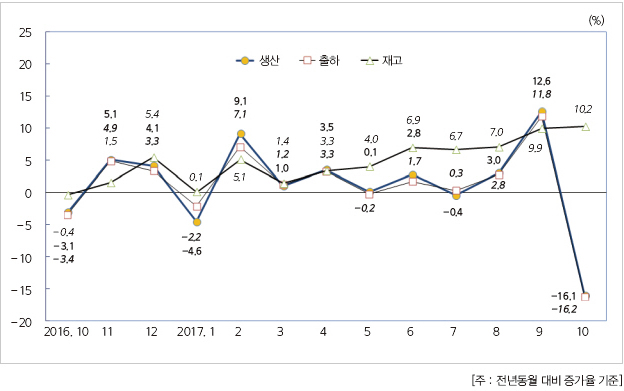 지난해 10월 기계산업 생산은 수송기계를 포함한 모든 업종에서 감소하여 전년동월 대비 16.1% 감소했다. 출하 또한 모든 업종에서 부진하여 전년동월 대비 16.2% 감소했다. 재고는 금속제품을 제외한 모든 업종에서 증가하여 전년동월 대비 10.2% 증가했다.