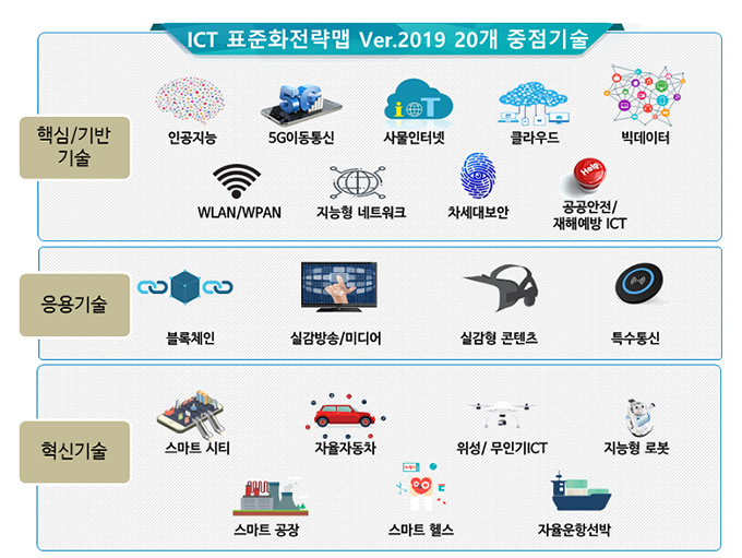 TTA는 5G, 인공지능 등 핵심 기반기술과 블록체인, 자율자동차, 지능형 로봇 등 응용 및 혁신기술을 포함한 20개의 중점기술을 선정하고, ICT 표준화전략맵 Ver.2019 개발을 3월부터 추진한다고 발표했다.