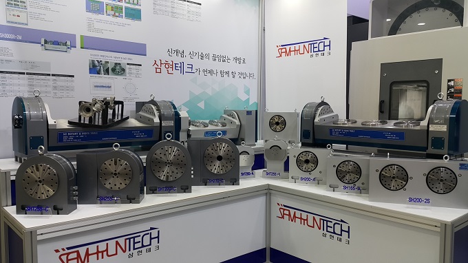 삼현테크의 인덱싱 & 멀티 스핀들 틸팅 NC 로터리 테이블(SH300SR-2M)은 선반 기능과 MCT 기능을 하나로 합해 밀링 가공뿐 아니라 선반 가공이 가능한 복합 기능을 실현했다. 이 제품은 고절삭 고정밀 가공에 높은 안정성과 평행도 및 반복 정도를 유지하며, 기존 MCT 장비에서도 간단한 준비 작업만으로 적용이 가능하다.