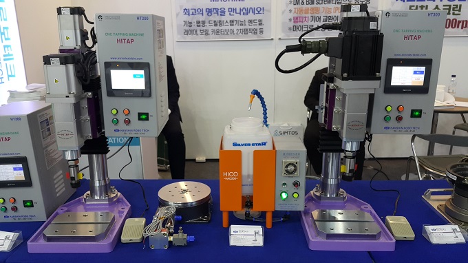 SIMTOS 2018에 참가한 한신로보테크는 참관객들에게 나사(탭홀) 검사 기능을 갖춘 CNC 탭핑 머신을 선보였다. 이 제품은 서보 모터(스핀들+상하 이송) 구동으로 정밀 제어가 가능하고 터치스크린 방식으로 되어 있어 조작이 간편하다. 또한 탭 피치 기어 교환이 필요 없고 마이크로 소형 탭 작업에 적합하다.