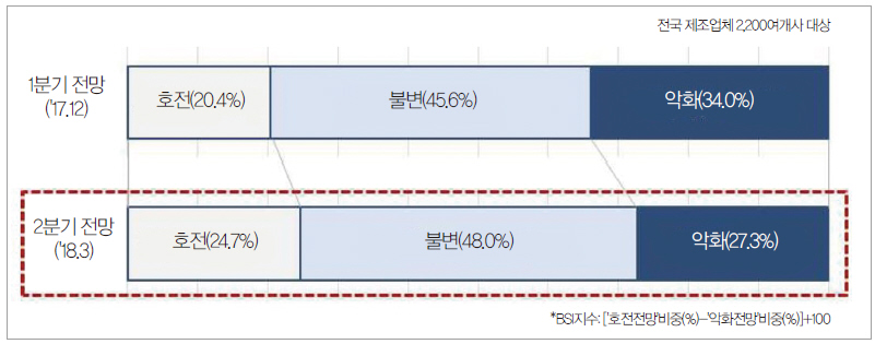 대한상공회의소(회장 박용만)가 최근 전국 2천2백여개 제조업체를 대상으로 ‘2분기 경기전망지수(BSI: Business Survey Index) 조사’를 실시한 결과, 전국 경기전망지수는 전분기 대비 11포인트 상승한 97로 집계돼 2015년 2분기(97) 이래 3년 만에 기준치(100)에 가장 근접한 수준까지 올랐다.