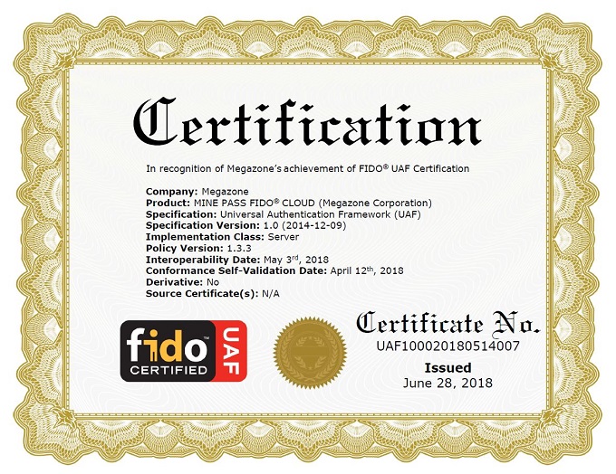 이번에 메가존의 솔루션 마인패스(MINE PASS)가 통과한 UAF 방식은 생체정보 등을 이용해 패스워드 없이도 강력한 보안을 구현하는 국제 표준규격이다.