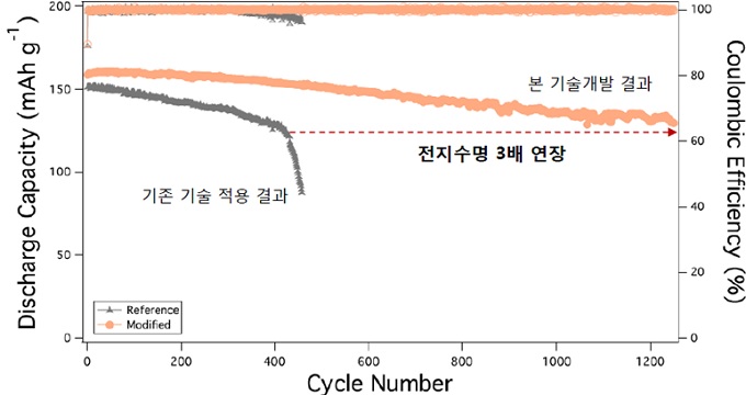 이러한 인조 보호막과 전해질 배합을 통해 1,200회 이상 충‧방전을 하더라도 초기 성능 대비 80%를 유지하고, 상용화된 리튬이온전지 수준으로 리튬금속의 양을 줄여도 200회 이상 충‧방전이 가능하다는 것을 확인했다.