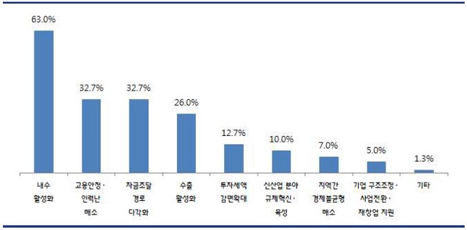 아울러 중소제조업 투자 활성화를 위해 역점을 두어야할 경제정책 방향(복수응답)으로 ‘내수활성화’(63.0%)를 가장 많이 꼽았고, 다음으로 ‘고용안정·인력난 해소’(32.7%), ‘자금조달 경로 다각화’(32.7%), ‘수출활성화’ (26.0%) 등의 순으로 응답하였다.