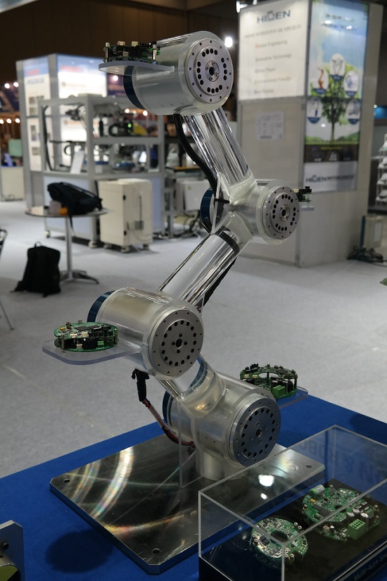 이번 전시회에서 하이젠모터가 선보인 제품은 로봇모듈 ‘ARES 시리즈’를 비롯해 6축 다관절 로봇, 델타로봇 등이다. 특히 6축 다관절 로봇(모델명: HMR-RVR6-0061500T)는 120kg의 중량에 반복 정밀도는 ±0.05mm, 탑재 하중은 6kg의 사양을 가진다. 또한 로봇 관절용 네트워크 드라이브 모듈인 ARES 시리즈는 전류 1.6~11.2A, 전압 24~48V이며 홀 센서와 디지털 엔코더를 장착하고 있다.