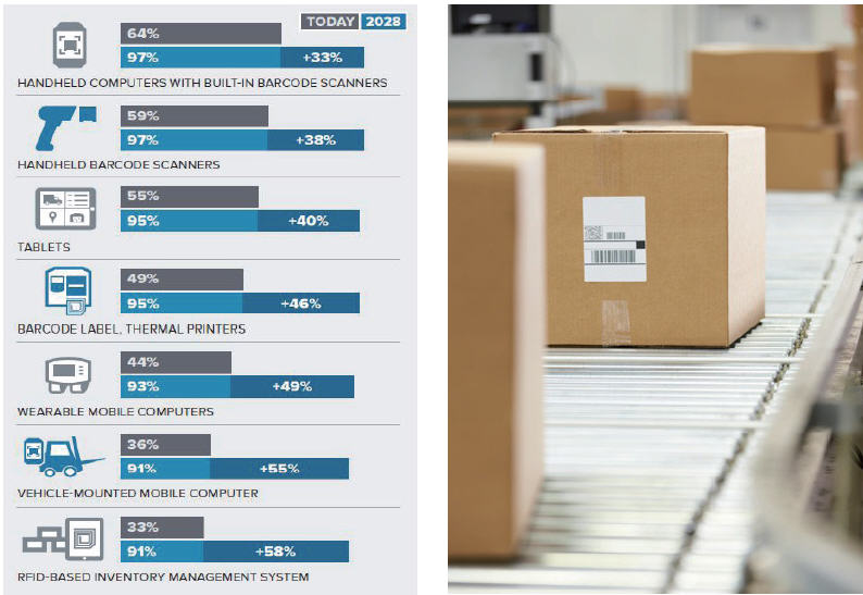 현재 전체 조직의 55%는 여전히 비효율적인 서류 기반 수작업을 통해 옴니 채널 물류를 구현하고 있다. 2021년에는 응답자의 99% 가량이 바코드 스캐너를 갖춘 핸드헬드 모바일 컴퓨터로 옴니 채널 물류를 관리하게 될 것이다. 펜과 종이를 기반으로 한 수기 방식에서 벗어나 바코드 스캐너를 갖춘 핸드헬드 컴퓨터 혹은 태블릿을 활용하면, 창고 관리 시스템에 실시간으로 접근할 수 있어 옴니 채널 물류가 개선될 것이다.