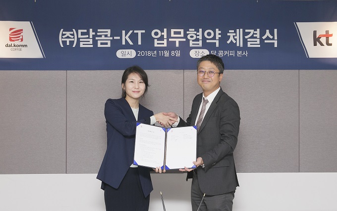KT(회장 황창규)가 달콤(대표 지성원)의 무인 로봇카페 ‘비트(b;eat)’에 기가지니 솔루션 적용을 위한 업무협약(MOU)을 체결했다고 8일 밝혔다. 이날 경기도 분당시 달콤 본사에서 열린 협약식에는 KT AI사업단장 김채희 상무, 달콤 지성원 대표 등 양사 관계자들이 참석했다.