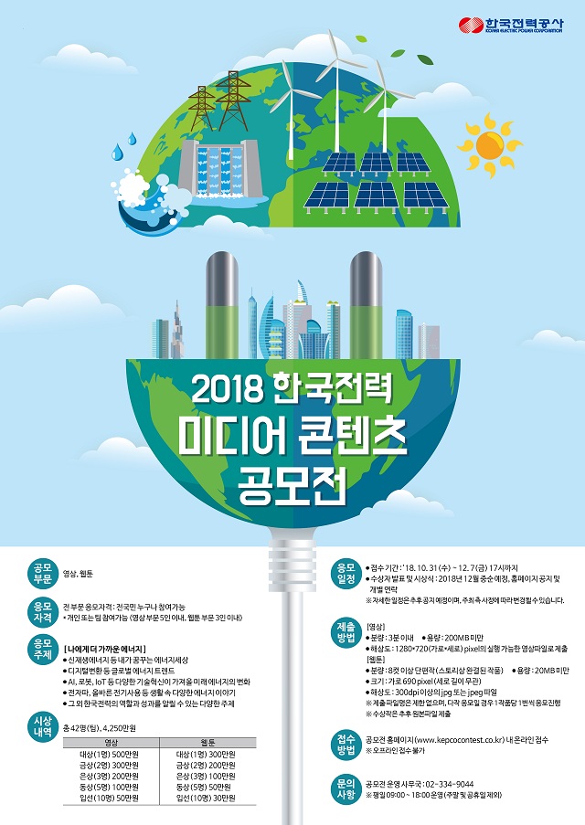 한국전력(대표이사 사장 김종갑)이 10월 31일부터 12월 7일까지 누구나 참여할 수 있는 ‘2018 한국전력 미디어 콘텐츠 공모전’을 개최한다고 밝혔다.