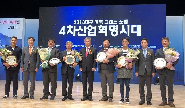 ▲‘2018 대구·경북 그랜드포럼’에서 4차 산업혁명 선도기업 수상자들이 기념촬영을 하고 있다.