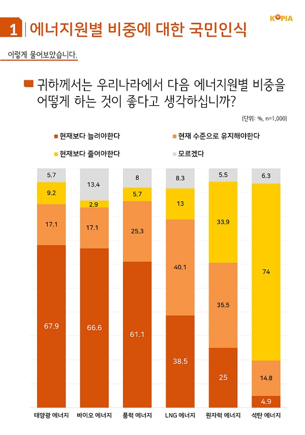 ‘현재보다 줄여야 한다’는 의견은 석탄(74.0%)의 비중이 특히 높았고, 원자력(33.9%)과 LNG(13.0%), 태양광(9.2%), 풍력(5.7%), 바이오(2.9%) 등이 그 뒤를 이었다.