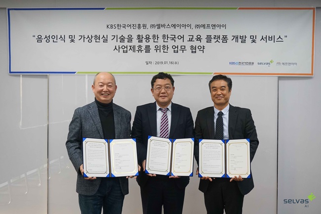 인공지능 전문기업 셀바스 AI가 KBS한국어진흥원 및 가상현실 전문기업 에프앤아이와 ‘음성인식가상현실 기술을 활용한 한국어 교육 플랫폼 해외사업 확대’를 위한 전략적 MOU를 체결했다.