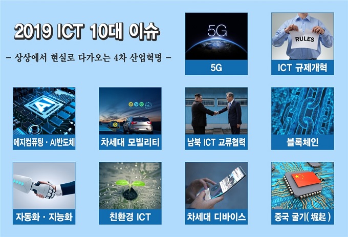 2019 ICT 10대 이슈로 △5G 서비스 상용화와 新융합 서비스 대두 △4차 산업혁명 앞당기는 ICT 규제개혁 추진 △에지컴퓨팅·지능형(AI)반도체 도입 확대 △상상에서 현실로 다가오는 차세대 모빌리티 △남북 ICT 교류협력 확대 △블록체인, 非금융 분야로 확산 △산업 全 분야로 자동화/지능화 기술 도입 증가 △기후변화와 환경오염에 대응하는 친환경 ICT △차세대 스마트 디바이스 혁신 △중국몽(中國夢)을 꿈꾸며 부상하는 중국 ICT가 선정되었다.