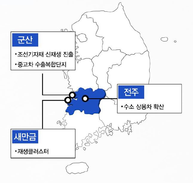 전북은 군산조선소 가동 중단과 GM공장 폐쇄로 침체를 겪고 있는 전북 경제 활성화를 위해 지역의 상용차 기반, 재생에너지 사업과 연계한 신산업 창출방안을 모색한다. 즉, 수소 상용차 생산 거점화 추진(전주), 군산항에 중고차 수출 복합단지 조성 추진(군산), 조선기자재 업체의 재생에너지 사업 진출 지원(군산), 국내 최대 재생에너지 클러스터 조성(새만금) 등이 추진된다.