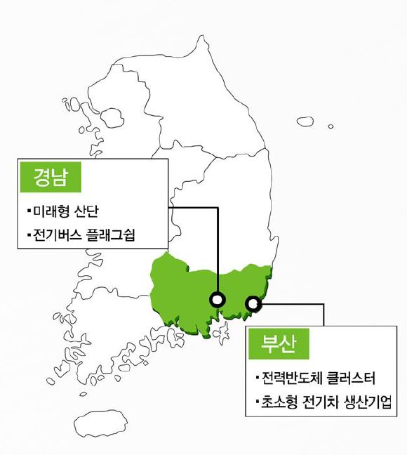 부산·경남은 조선·자동차 등 전방산업 부진이 지역내 주력업종인 기계산업으로 확산될 우려가 있어, 지역 중소 자동차 업계의 일감창출 방안을 마련하고 노후된 산단도 미래형 산단으로 혁신하는 부흥전략을 추진한다. 지역별로 수원시 등 노후 경유버스를 전기버스로 교체(함양), 르노 초소형 전기차 위탁생산(부산), 전력반도체 파운드리 건설 및 관련기업 집적화(부산), 미래형 산단으로 전면 개편(창원) 등이 추진된다.