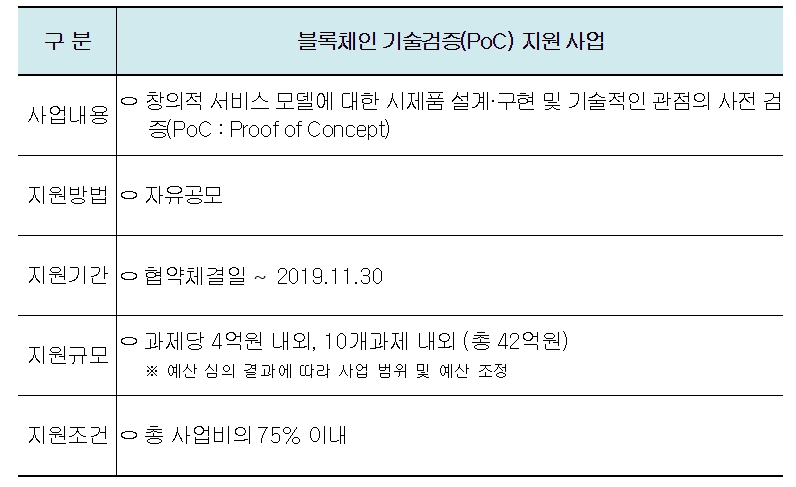 지원대상은 블록체인 기술을 보유한 기업(단독 또는 콘소시엄)이며, 자유공모로 총 10여 개 과제를 선정하여 과제당 4억원 내외를 지원할 계획이다.