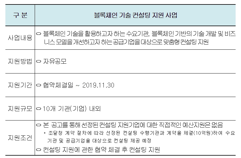 블록체인 기술 컨설팅 지원 사업은 산업 전반에 블록체인 기술이 확산될 수 있도록 블록체인 기술을 도입하거나 활용하고자 하는 기업을 대상으로 컨설팅을 제공하는 사업이다. 지원 대상은 블록체인 기술을 도입하고자 하는 수요기관과 블록체인 기술 기반의 시스템을 개발하고자 하는 공급 기업이며, 자유공모 방식으로 총 10개 기업 및 기관을 선정할 예정이다.