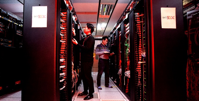 ▲ SK텔레콤 직원들이 성수 교환국사에서 양자난수생성기가 적용된 가입자 인증서버를 점검하고 있는 모습.