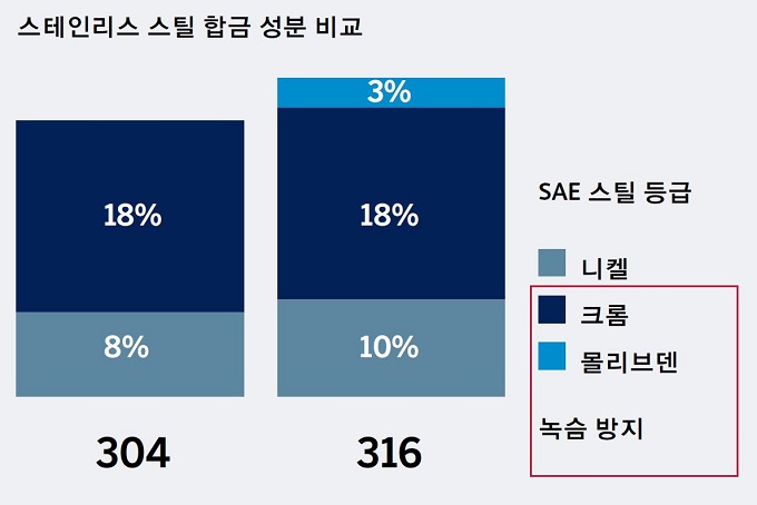위생 식품 표준은 거친 세척 환경에 대해 18% 이상의 크롬과 10%의 니켈을 권장하고 있으며 이는 보통 316 SAE 등급으로 알려져 있다. 316 스테인리스 스틸은 몰리브덴이 첨가되어 보통의 304 스테인리스 스틸(18% 크롬, 8% 니켈) 보다 대부분의 거친 세척 환경에서 우수한 성질을 갖는다. 몰리브덴은 염화물, 황산, 염산 및 대부분의 유기 화합물을 포함한 산으로 인한 부식을 견딜 수 있다. 316 스테인리스 스틸은 304 등급에 비해 뛰어난 염화물 내부식성으로 인해 바다에서 쓸 수 있는 스테인리스 스틸로 알려져 있다.