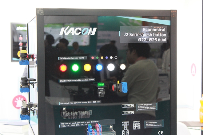 KACON은 이번 전시회에서 자사의 강점인 제어 스위치를 선보여 참관객의 눈길을 끌었다. 제어 스위치인 'J2 시리즈'는 소형 저 중량의 콤팩트한 디자인으로 제작됐다. 이 제품은 볼트가 안쪽으로 들어가 있는 보호 구조 안전 터미널 블록이 장착돼 감전 사고를 방지한다.