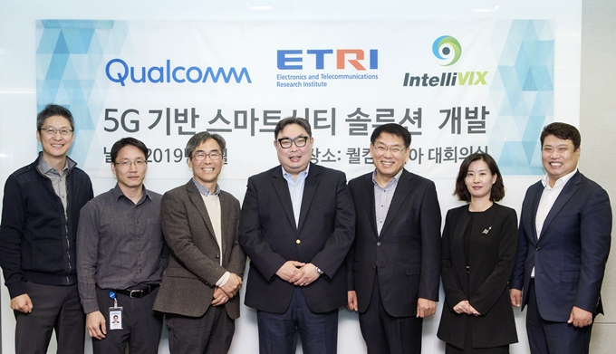 ▲ 김현 한국전자통신연구원(ETRI) IoT 연구본부 본부장(왼쪽에서 세번째), 권오형 퀄컴코리아 사장(중앙), 유명호 인텔리빅스 대표(오른쪽 세번째) 및 관계자들이 기념 촬영을 하고 있다.
