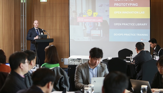 ▲ 이달 9일, 인터컨티넨탈 서울 코엑스에서 레드햇은 기자간담회를 통해 레드햇 오픈 이노베이션 랩(Red Hat Open Innovation Labs) 서비스의 국내 출시를 발표했다.