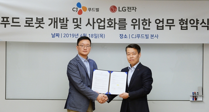 LG전자와 CJ푸드빌은 18일, 서울시 중구 소재 CJ푸드빌 본사에서 LG전자 로봇사업센터 노진서 전무, CJ푸드빌 전략기획담당 오광석 헤드 등 양사 관계자들이 참석한 가운데 업무협약(MOU)을 맺었다고 밝혔다.