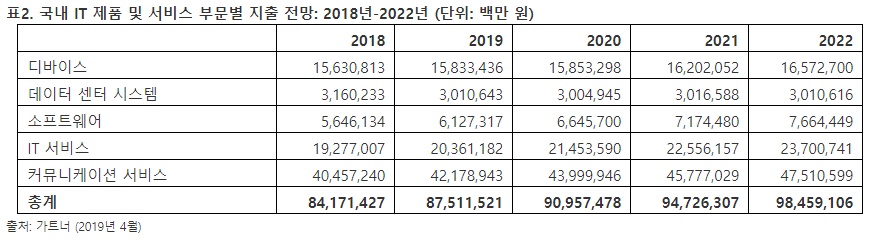 한편, 올해 국내 IT 제품 및 서비스에 대한 지출 규모는 전년 대비 4% 성장한 87조 5천 억 원 이상이 될 것으로 예상되며, 2022년에는 98조 5천억원에 이를 것으로 보인다.