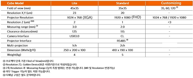 Cube는 TI(Texas Instruments)사의 DLP기술을 적용하였으며 여기에 사용되는 DMD(Digital Micromirror Device)는 과거에 프로젝터 용으로 많이 사용되던 LCOS Diplay소자에 대비해서 2배이상 빠른 속도, 10만 시간의 소자수명, UV에 대한 안정성, 4~5배의 밝기의 장점 등을 갖추고 있다. 또한 과거의 Pezo(PZT)를 사용하는 아날로그 방식에 대비해서도 속도가 빠르고 Settling타임이 없이 안정적으로 패턴이송이 가능하고 기계적인 움직임이 없기 때문에 캘리브레이션에 용이하고 유지보수가 쉽다. 그리고, 머신비전에서 가장 중요하고 기본적인 2D검사와 접목하여 기존 2D 비전을 그대로 사용하면서 3D 영상을 부가적으로 취득할 수 있어 기존 검사 솔루션과 함께 검사 성능을 획기적으로 보완할 수 있는 솔루션을 제공할 수 있다.