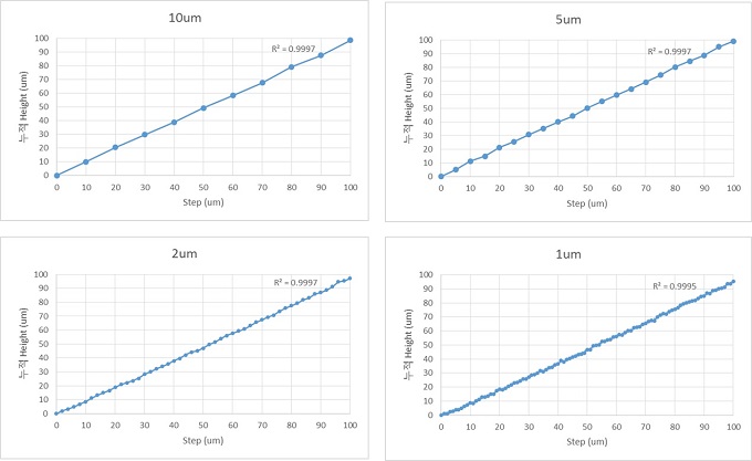 양산용 계측 시스템으로 적합한가를 판가를 하기 위하여 3D 측정 선형성을 테스트 하였다. 이오비스 Cube Customizing 모델 중 FOV가 가장 크고 패턴간격이 가장 넓은 3Di-120 프로젝터를 사용하였으며 정밀 Z축 스테이지를 통해 측정면의 위치를 정확하게 변경하면서 기준면 대비 상대 높이를 측정 하였다. 이때, 전체 100um 변위를 1um간격으로 증가시키면서 100회, 2um간격으로 증가시키면서 50회, 5um 간격으로 증가시키면서 20회, 10um 간격으로 10회 증가시키면서 Cube를 통해 높이를 측정하였다.