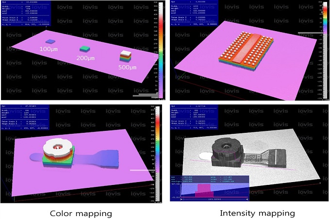 또한 CUBE 3D는 레이저 센서 방식이 아니기 때문에 2D와 3D 측정이 동시에 가능하며, CUBE 3D는 광효율이 뛰어나 1000:1 이상의 명암비로 선명하고 반복능 1µm 이내의 정밀한 측정이 가능하다.