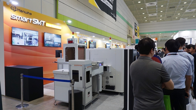 한화부스에서는 전시회 20주년을 기념해 한화와 주최사 주관으로 전시장 내에 스마트 팩토리 반응형 SMT 데모 라인이 국내 제조사들의 참여와 함께 시연돼 참관객들의 뜨거운 반응을 이끌었다.