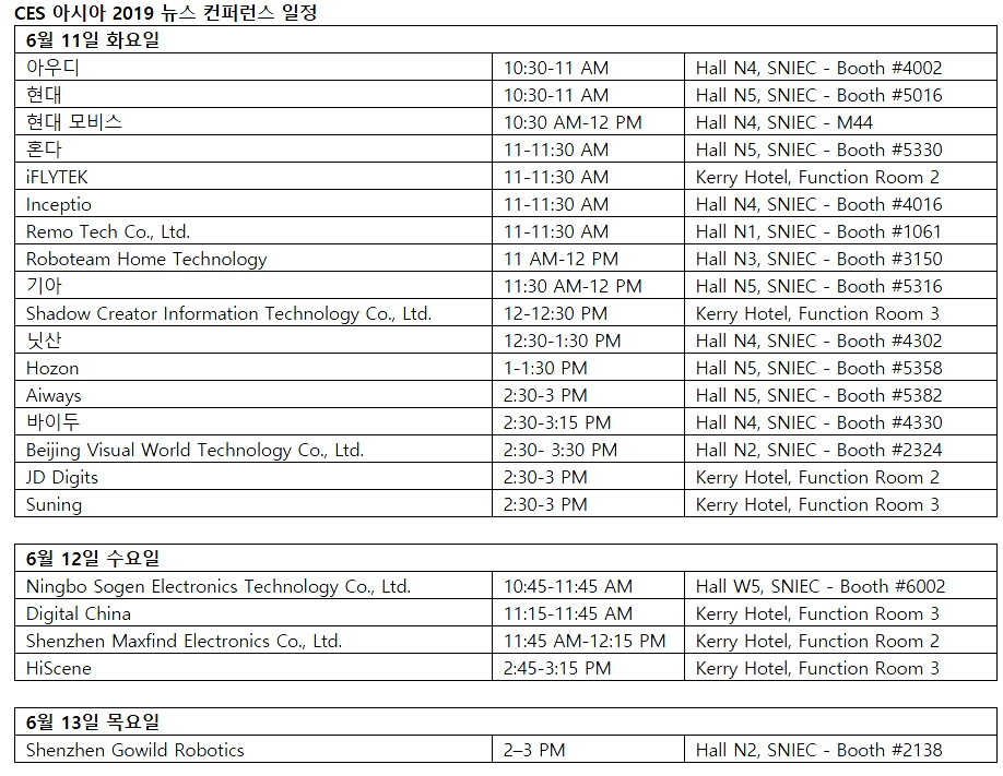 아우디, 바이두, 혼다, 현대, iFLYTEK, 기아, 닛산, Suning 등의 기업들이 현장에서 뉴스 컨퍼런스를 개최하고 신제품 및 주요 소식을 발표할 예정이다. CES 아시아 2019는 오는 6월 11일부터 13일 중국 상해 신국제엑스포센터(Shanghai New International Expo Centre; 이하 SNIEC)에서 개최된다.