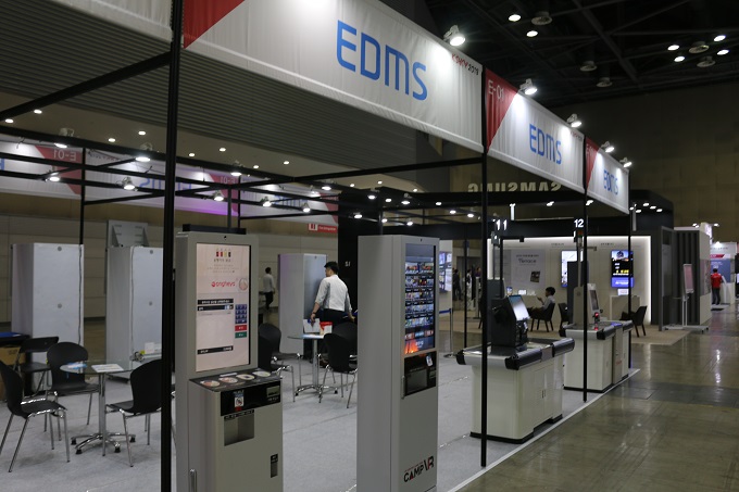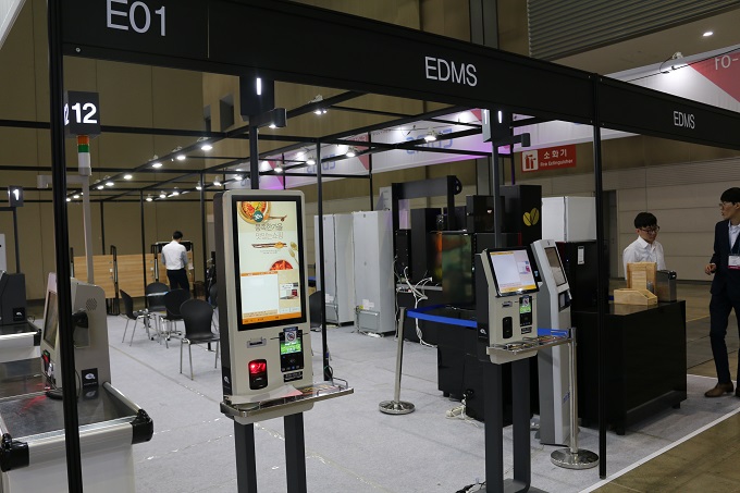 이디엠에스는 케이샵(K SHOP)에서 셀프계산대, 식권발매기 그리고 무인카페와 같은 무인결제 시스템을 선보였다.