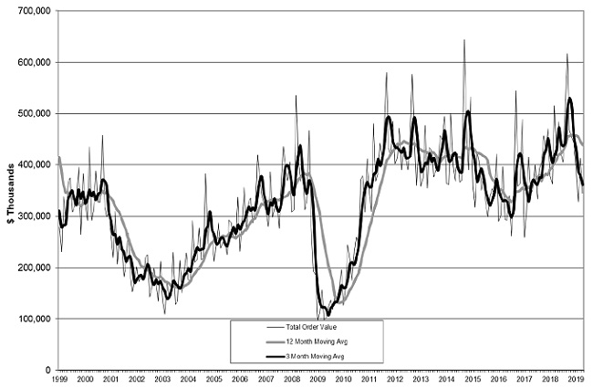 ▼ 2019년 4월 미국 공작기계 수주 현황 (Total U.S. Manufacturing Technology Orders Through April 2019)