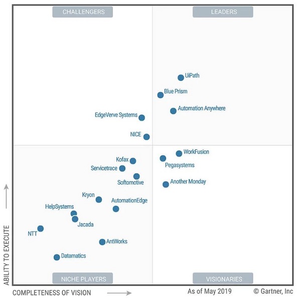 유아이패스는 가트너 매직 쿼드런트가 평가한 RPA 부문의 18개 공급 업체 중 비전 실행 및 완성도 측면에서 가장 높은 평가를 받으며 RPA 글로벌 1위 기업으로 입지를 다시 한 번 굳혔다.