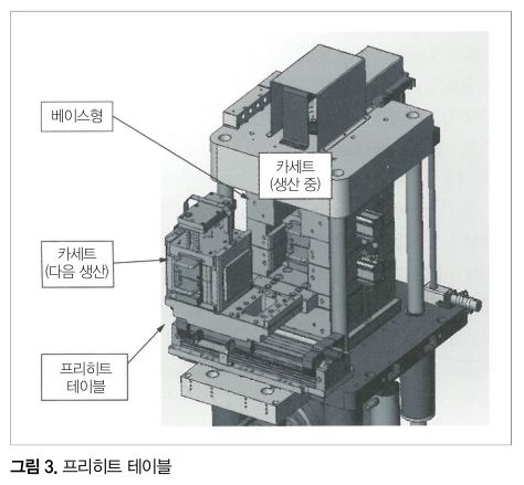 또한, MR30은 재료 건조, 제품 취출, 러너 분쇄를 탑재한 올인원 구조로 하고, 이들 설정(건조 온도나 취출 설정 등)을 일괄 관리하고 있다. 이 MR30에는 카세트의 예비 가열이나 자동 교환을 하는 프리히트 테이블을 증설할 수 있다(그림 3). 이 프리히트 테이블에는 앞으로 생산을 개시하는 카세트, 생산이 종료해 베이스형에서 취출된 카세트의 2면을 탑재할 수 있고, 이들 제어도 MR30이 상위 지령에 의해 한다.