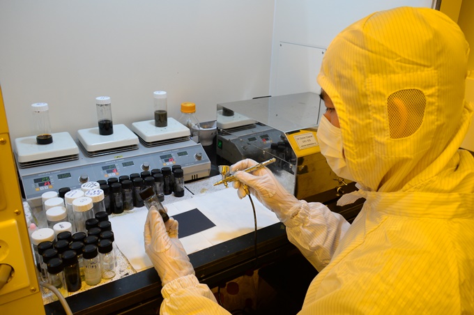 ▲ 전도성 나노 소재를 유연 플라스틱 기판 위에 스프레이 코팅하고 있다.
