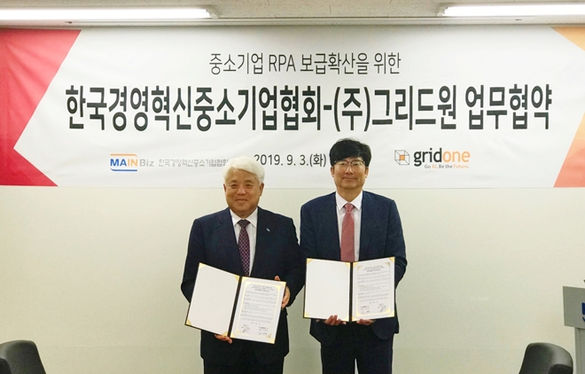 그리드원은 지난 2일 한국표준협회, 3일 한국경영혁신중소기업협회와 중소기업 RPA 보급 확산을 위한 업무 협약(MOU)을 체결했다고 밝혔다.
