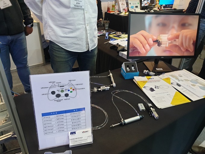 한국하이엑트 지능기술은 세계 최초이자 초소형 양방향 친환경 수압펌프 'AquaBrixel'를 소개했다. 초소형, 초경량으로 투명하며 깔끔한 외관을 지니고 있으며, 양방향 피스톤 펌프, 밸브가 필요없다. 모터제어만으로 유량, 압력, 방향을 제어할 수 있다.
