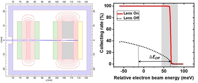 그림3. (왼쪽) 에너지 분석기의 단면도 / (오른쪽) 시뮬레이션 결과: 신호 손실 없이 장치 성능이 대폭 향상됨