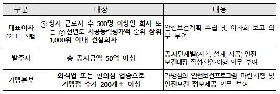 사업주 뿐만 아니라 대표이사(`21.1.1. 시행), 건설공사 발주자, 프랜차이즈 가맹본부에도 산재예방 책임이 부여된다. 하청노동자의 안전을 강화하기 위하여 도급인(원청)의 책임범위 확대, 의무사항 부여 및 의무이행 등이 강화됐다.