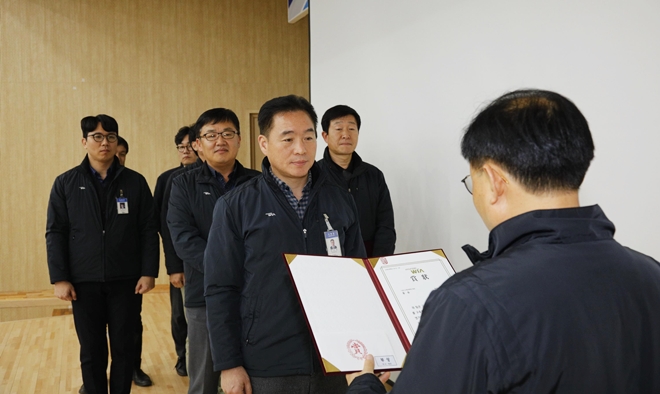 ▲워크숍에서 진행된 시상식에서 윤일상 매니저가 우수 리더로 수상받고 있다. (사진 : 현대위아)
