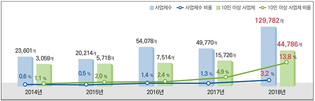 사물인터넷 이용률은 2018년 기준 3.2%이지만, 10인 이상 사업체 기준으로는 2014년 1.1%에서 2018년 13.8%로 약 13배나 증가한 것으로 나타났다.