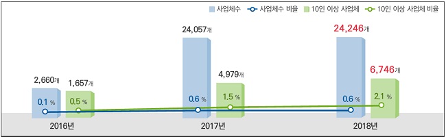 또한, 인공지능 이용률은 2018년 기준 0.6%에 불과하나, 10인 이상 사업체 기준으로는 2016년 0.5%에서 2018년 2.1%로 최근 3년간 약 4배 증가한 것으로 나타났다.