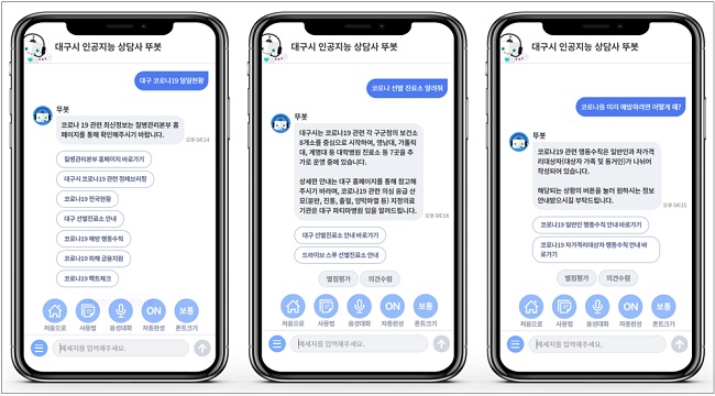 인공지능 기반 자연어 처리 전문기업 아이브릭스(대표 채종현)는 코로나바이러스감염증-19(이하 코로나19) 사태로 현재 어려움을 겪고 있는 대구 시민들에게 대구광역시 AI 민원상담 시스템(이하 뚜봇)을 통해 코로나19 관련 종합 정보를 지난 4일부터 제공했다고 밝혔다.